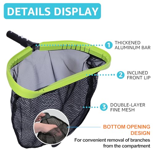 [Easily scoop out debris with inclined lip pool net] Our heavy duty aluminum frame pool net is designed with a widened and inclined edge that makes it easy to scoop out debris from the bottom of the pool.