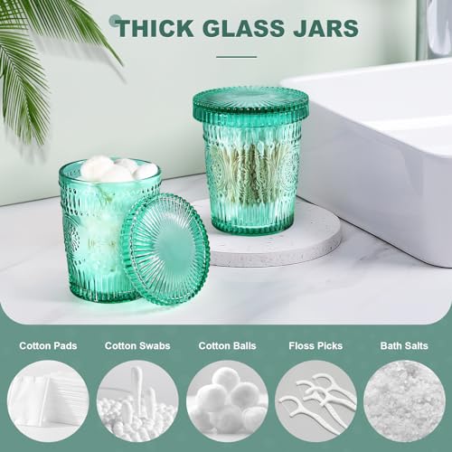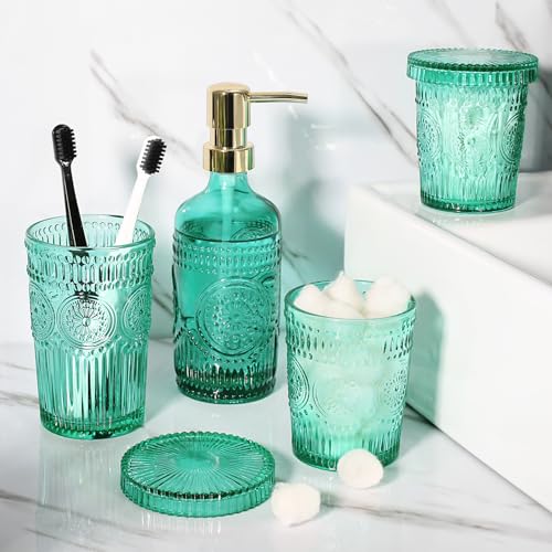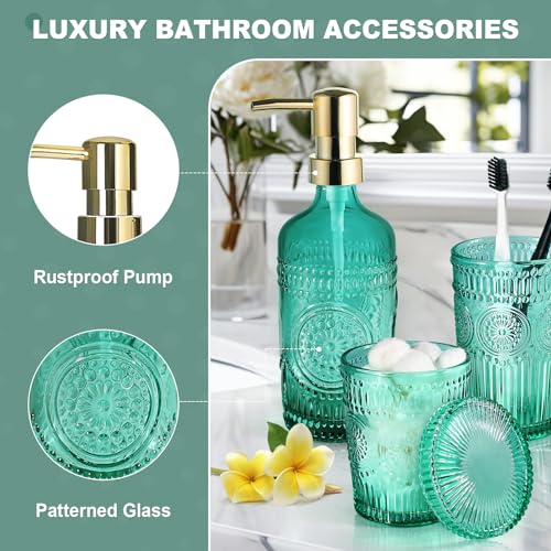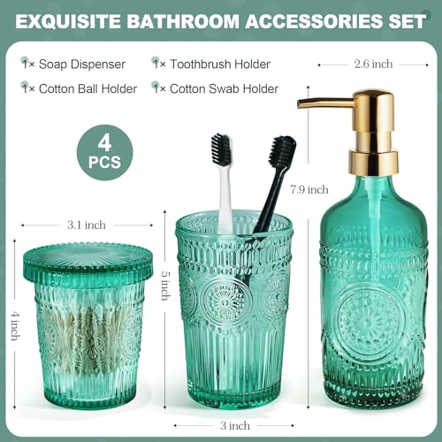 Teal Bathroom Accessories Set, 4 Pcs Glass Bathroom Accessory Sets Complete, Bath Soap Dispenser and Toothbrush Holder Set, Qtip Cotton Ball Holders, Green Bathroom Counter Decor Sink Set