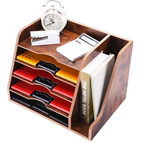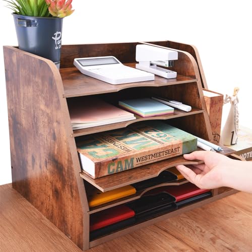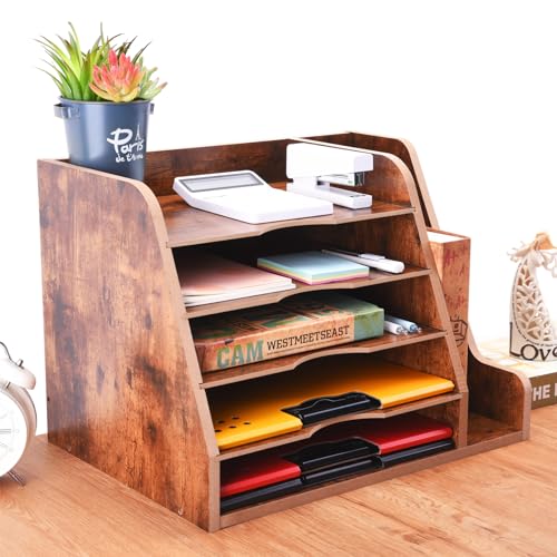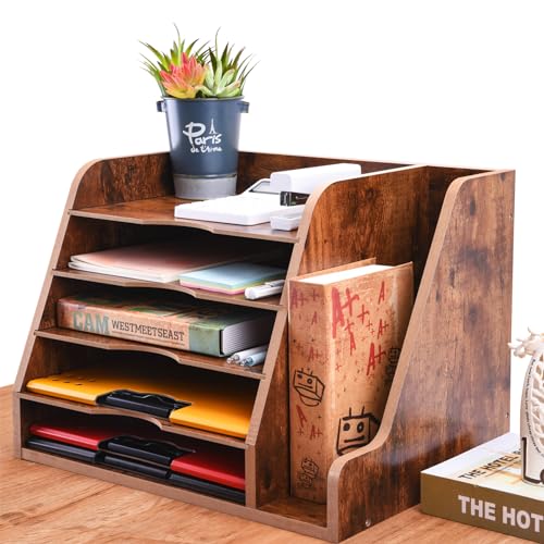 WuGeShop 5 Tier Paper Letter Tray Organizer with File Holder, Wood Desk File Organizer with Magazine Holder, Rustic Desktop Organizers and Accessories for Office Supplies Home or School, Brown