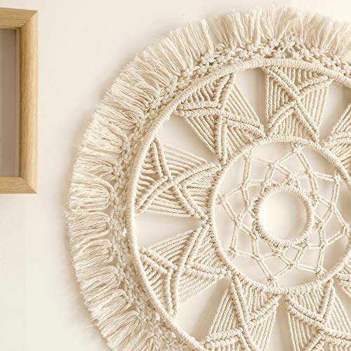 Adorable Size: 15″ L × 15″ W, it is a very nice hanging looking and elegant wall decoration. Warm Tips: Since the product is shipped fold. The macrame will be slightly crinkle when open the package, please comb the macrame fringe by comb to regain the shape