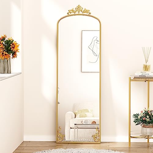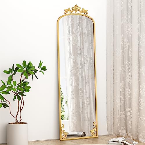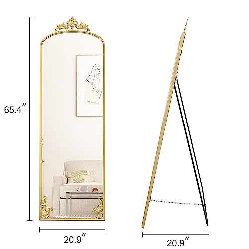 AZODY Arched Full Length Mirror with Carved Metal Frame, 65″ x 21″ Gold Floor Length with Stand, Full Body Mirror for Home Decor Wedding Entryway Living Room