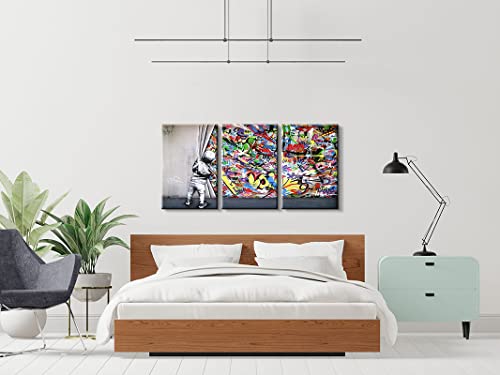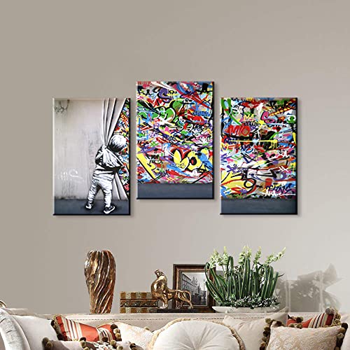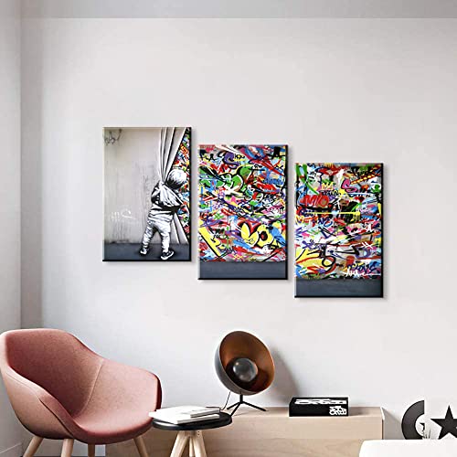 YOUHONG Banksy Graffiti Canvas Wall Art – 3 Panels Colorful Pop Art Wall Decor Behind the Curtain with Wooden Frame, Ready to Hang (12”Wx16”Hx3PCS)