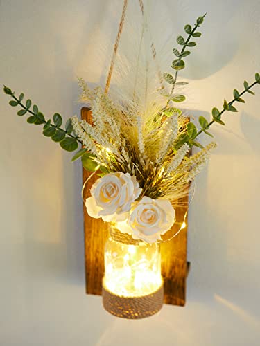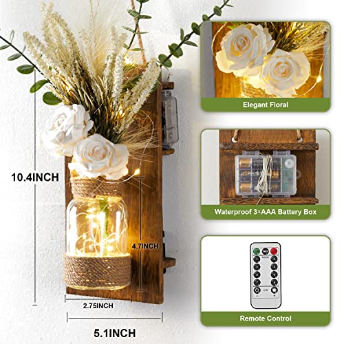 Anna’s Whimsy 2PACK Mason Jar Sconce Wall Decor Rustic with Remote Control LED Fairy Lights – Artificial Flowers Spring Decorations for Home Bedroom Farmhouse(White Rose)