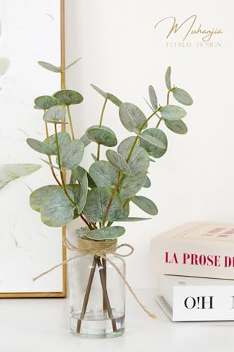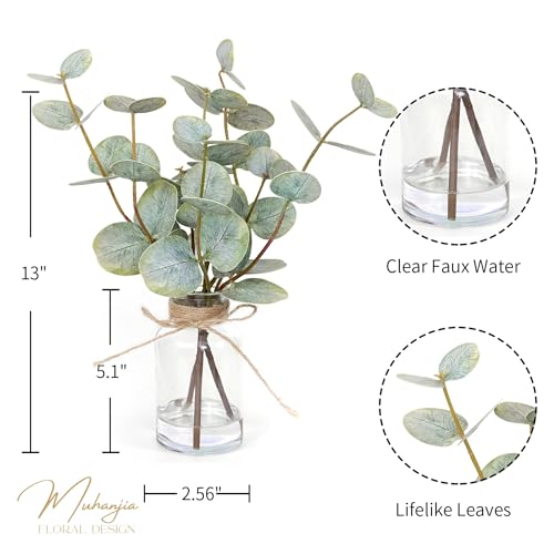 💗【Perfect Size】Overall:13 inches height, Approx 11.8 inches width. Decorative glass vase is 2.6Wx5.1H inches. There are 3Pcs fake plant with double-sided eucalyptus leaves in vase,and each 1Pc eucalyptus plant has three branches, totaling 17 leaves.