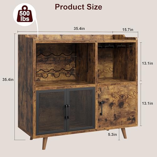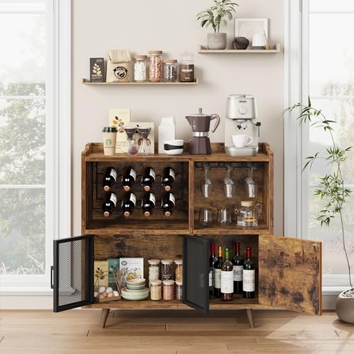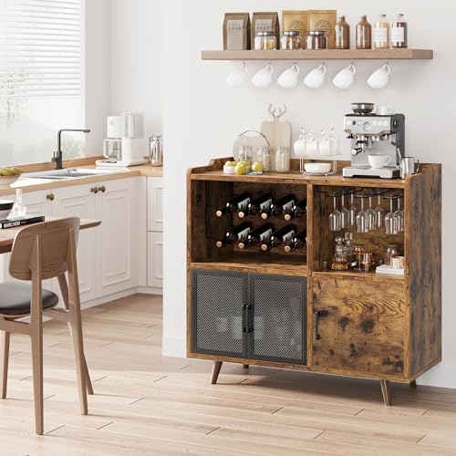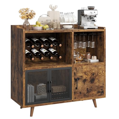 IDEALHOUSE Coffee Bar Cabinet, Vintage Buffet Storage Cabiniet with Mesh Doors, Accent Wine Bar Liquor Cabinet with Wine Rack for Kitchen Living Dining Room, Rustic Brown