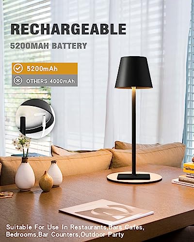 Nerefou 2 Pack Cordless Table lamp, 5200mAh Battery Operated Lamp,3 Color Stepless Dimming Desk Lamp,IP54 Waterproof Outdoor Table Lamps for Restaurant/Bedroom/Bars/Camping/Cafe Night Light (Black-2)